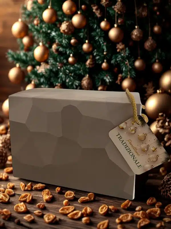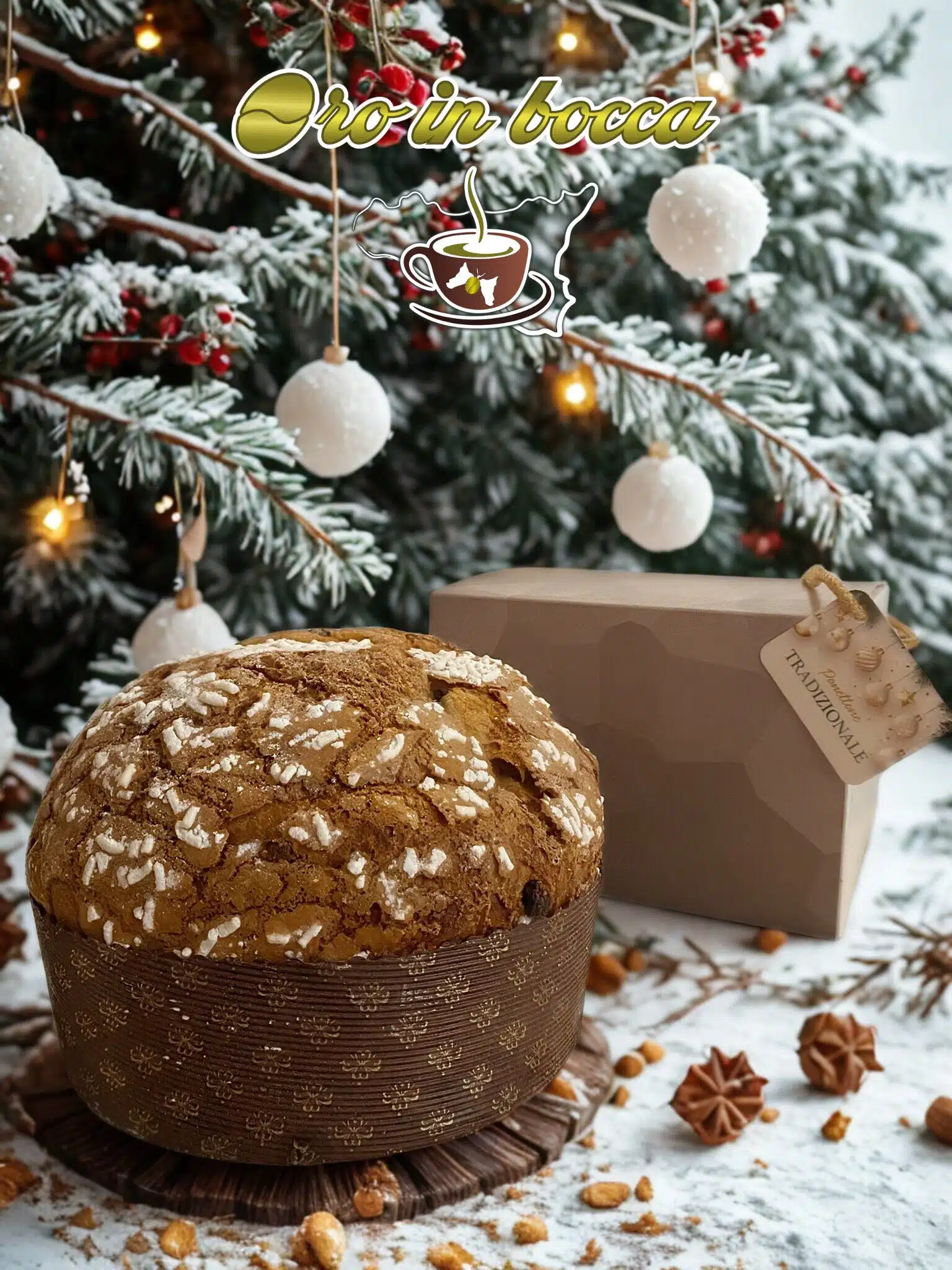 Panettone artigianale tradizionale Oro in Bocca, a lenta lievitazione naturale, soffice e profumato, arricchito con uvetta e canditi. Il simbolo autentico delle feste.